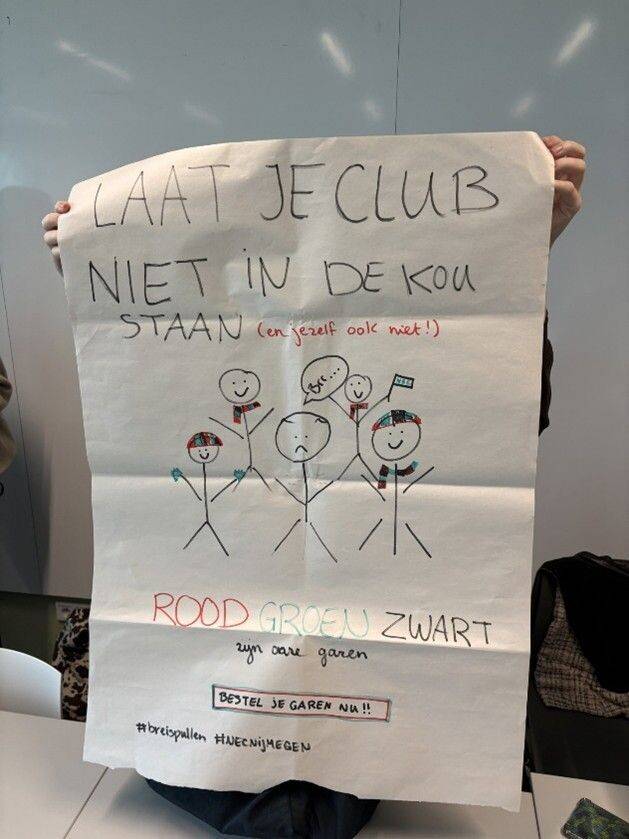 Bij beide workshops kregen studenten de opdracht om in groepjes een poster te maken. Hoe leuk om in beperkte tijd zo veel creativiteit te zien! Bij workshop 1 maakten ze een poster om je huisgenoten te stimuleren de keuken schoon te houden. 𝘝𝘰𝘰𝘳𝘬𝘰𝘮 𝘦𝘦𝘯 𝘣𝘢𝘬. 𝘉𝘳𝘦𝘯𝘨 𝘸𝘦𝘨 𝘥𝘪𝘦 𝘷𝘶𝘪𝘭𝘯𝘪𝘴𝘻𝘢𝘬. Bij workshop 2 grabbelden ze een doelgroep, product en benadering. Dit zorgde voor absurde combinaties. Verkoop breispullen aan NEC-hooligans met als benadering identificatie. Onmogelijk zou je denken… Toch niet!